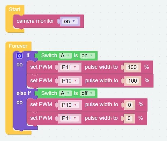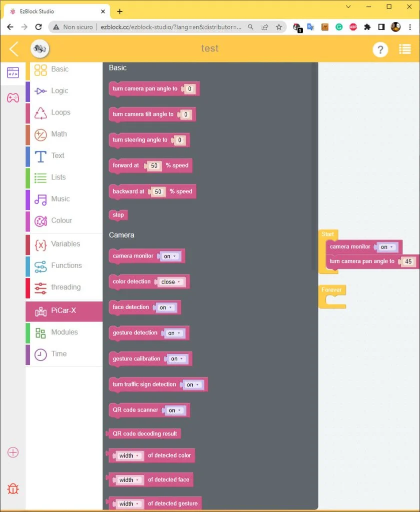 EzBlock allows users to control the PiCar-X’s motors, sensors, and other components by dragging and dropping blocks onto a canvas. For example, to make the PiCar-X move forward, users can drag a “set motor speed” block onto the canvas and set the speed value to a positive number. Similarly, to turn the PiCar-X left or right, users can drag a “set motor speed” block onto the canvas and set the speed values for each motor accordingly.