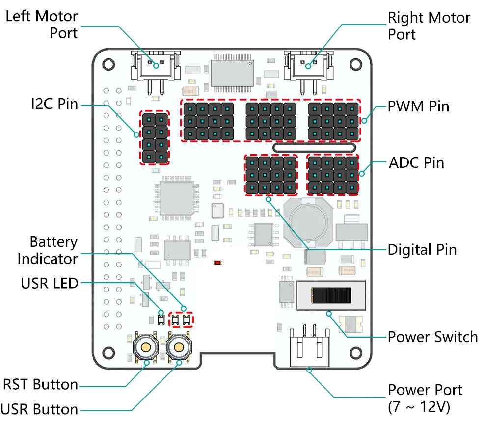- When you connect power to the power port, the Raspberry Pi will boot up. However, you will need to switch the power switch to ON to enable Robot HAT.