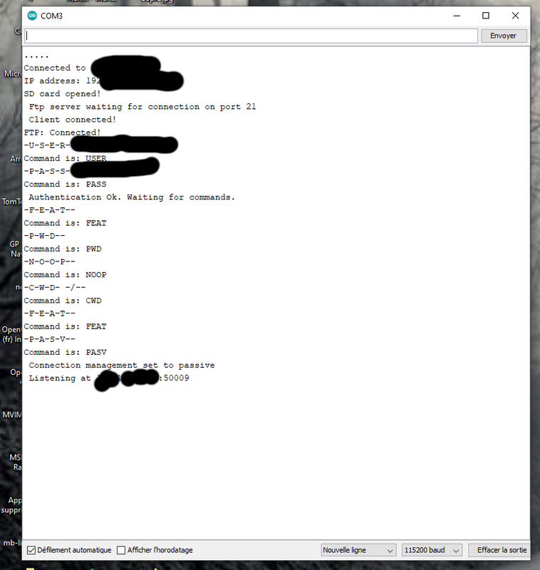 Utilisation de la bibliothèque SimpleFTPServer version 1.0.1 dans le dossier: C:\Users\2040d\Documents\Arduino\libraries\SimpleFTPServer