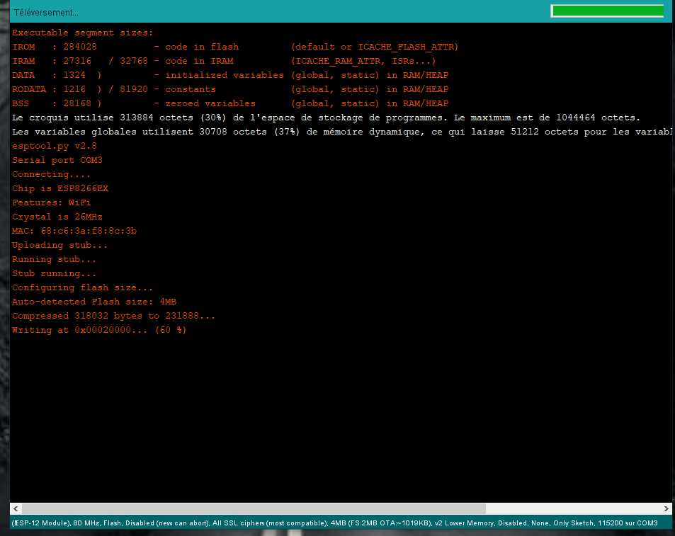 Le croquis utilise 323957 octets (31%) de l'espace de stockage de programmes. Le maximum est de 1044464 octets.